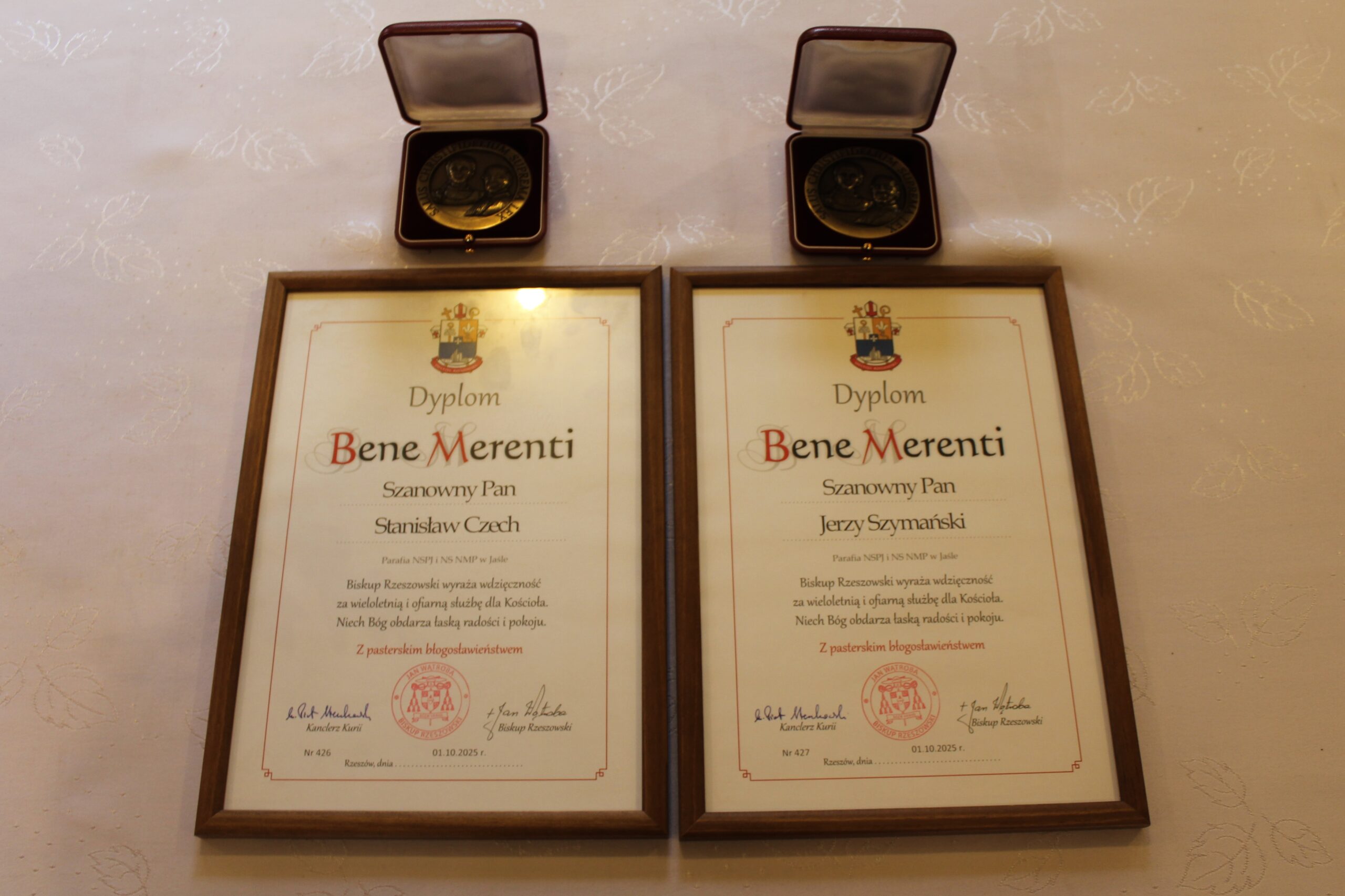 W Roku Jubileuszowym zbiegającym się z Jubileuszem 50-lecia naszej parafii, ks. Biskup Ordynariusz przyznał za długoletnią ofiarną pracę w naszej wspólnocie, Panu kościelnemu – Stanisławowi Czech i Panu organiście – Jerzemu Szymańskiemu, najwyższe kościelne odznaczenie „Bene Mereti”. Uroczyste wręczenie odznaczeń dokonał Dziekan- ks. mgr Marek Cesarz na Mszy św. o godz. 11.00. Odznaczonym serdecznie gratulujemy i życzymy łask Bożych na następne lata.