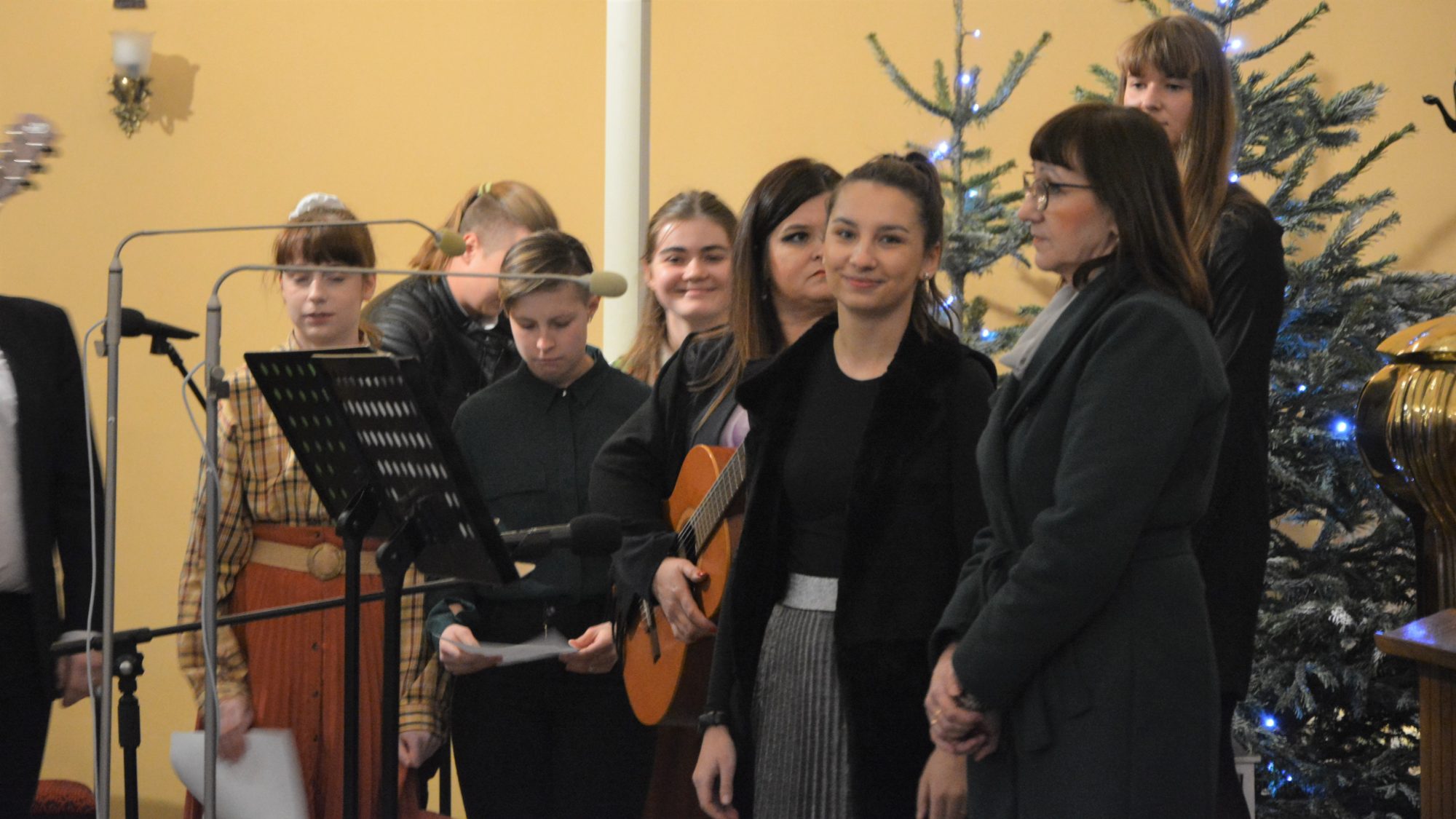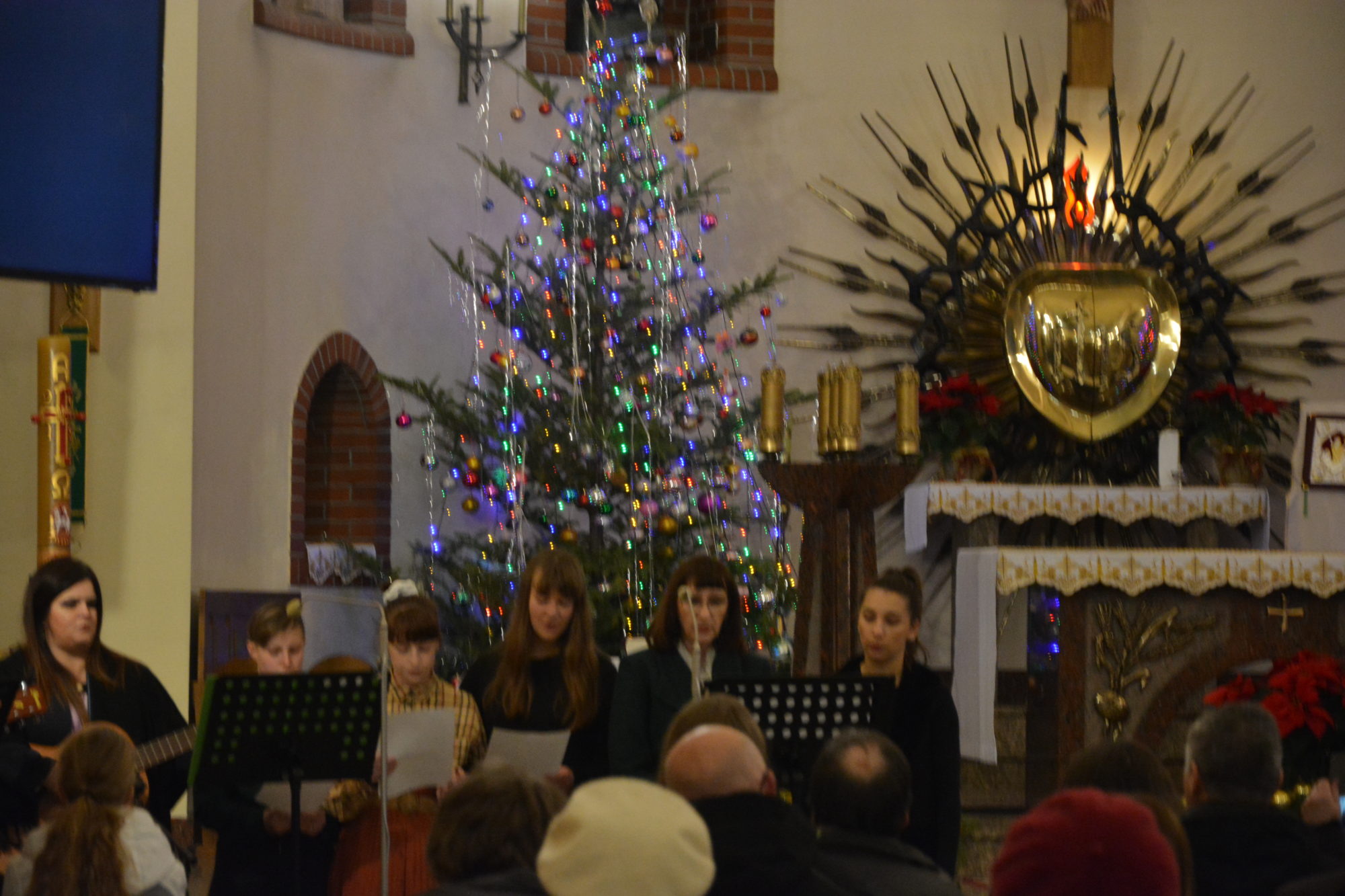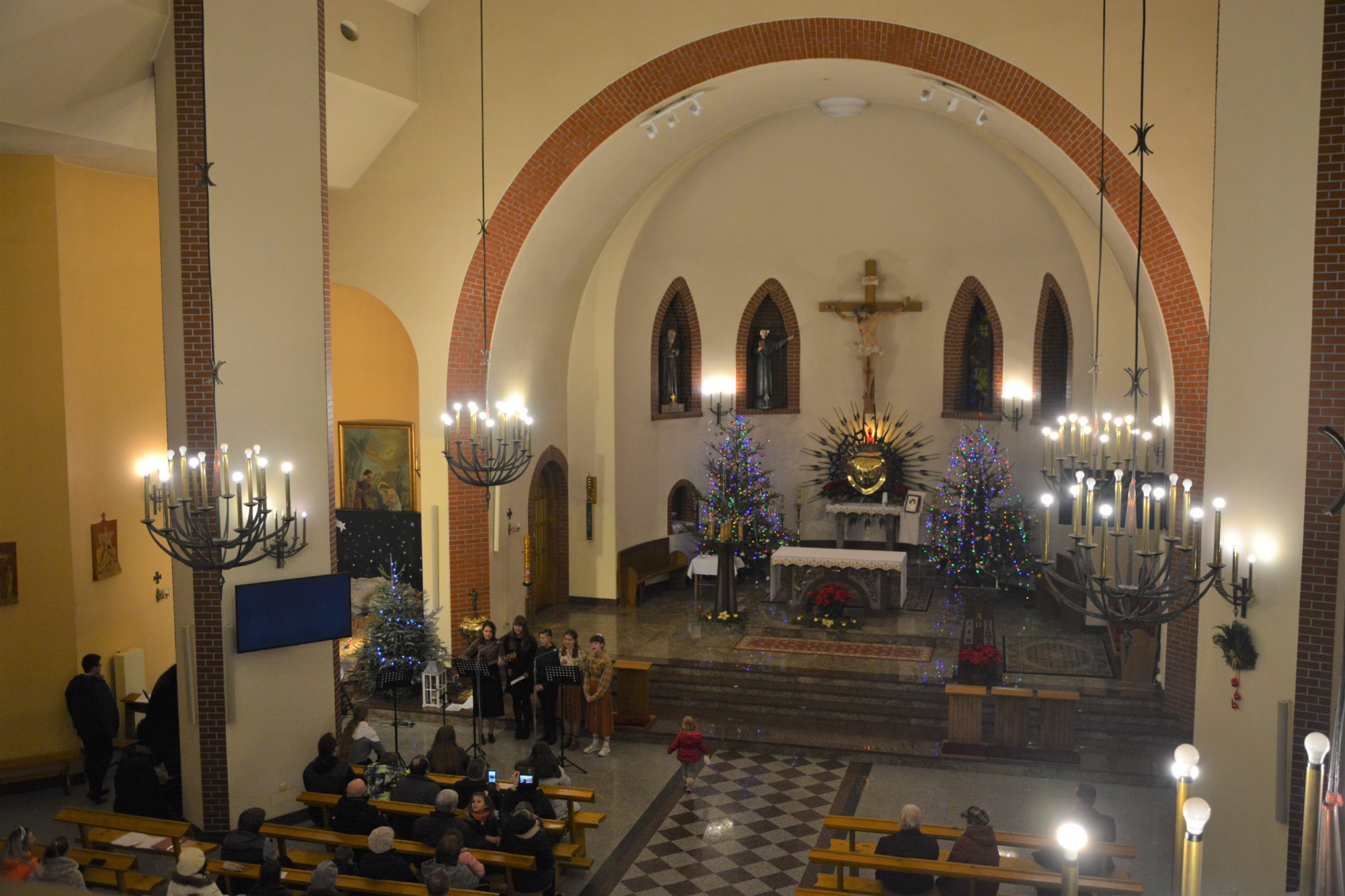 Tego wieczoru nie mogło również zabraknąć naszej młodzieży, a dokładnie Scholi parafialnej, która z zapałem wyśpiewała piękne XVII-wieczne, jak i współczesne kolędy. W ich wykonaniu mogliśmy usłyszeć: Złota Jerozolima, Pieśń Świąteczna, Oj Maluśki i barwne Bracia patrzcie jeno. Pomiędzy tymi wykonaniami wszyscy obecni również mieli okazję wspólnie zaśpiewać najstarsze i najbardziej znane kolędy.